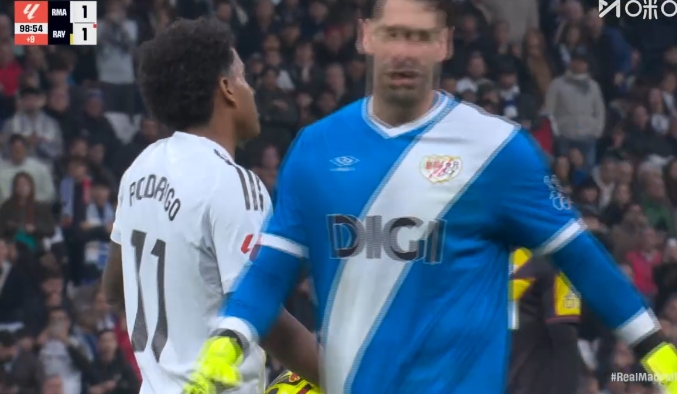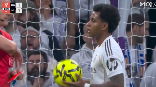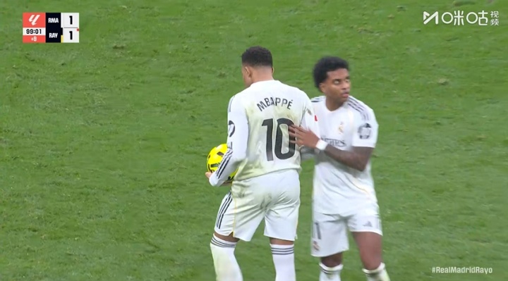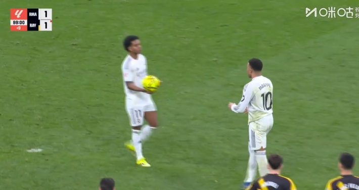 jiuyou-皇马获点后罗德里戈一直在点球点抱着球,最后姆巴佩上前接过皮球