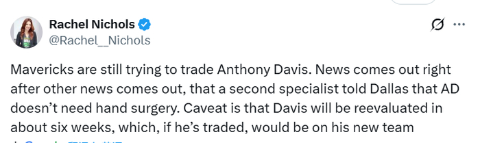 NBA记者Nichols表示,独行侠仍在尝试交易戴维斯。就在另一位专家告知达拉斯,戴维斯的左手无需接受手术的消息传出后不久,这一动态随即曝光。需要注意的是,戴维斯将在约六周后接受复查 —— 如果届时他已被交易,这次复查就将由他的新球队来安排。
