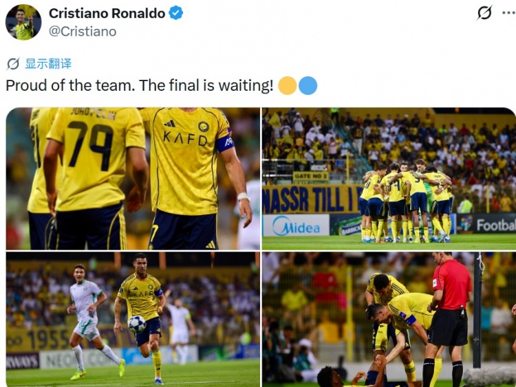 在社交媒体上,C罗对球队闯进决赛进行了庆祝,他写道:为球队感到自豪,决赛等着我们。