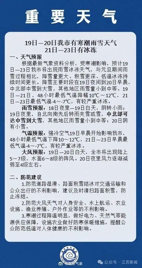 据南京气象:19日-23日将出现雨雪冰冻天气,比元旦期间降雪量更大、积雪更深!19日夜里中北部可达小雪到大雪!